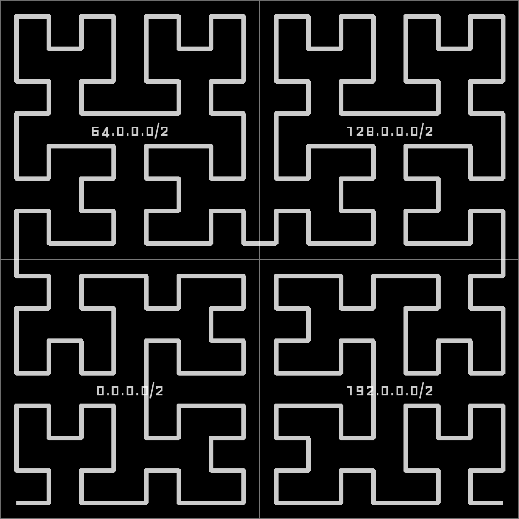A short introduction to Hilbert curves: Hilbert curves are a way to map a one-dimensional space into a higher-dimensional space, in our case: 2D. This is useful because computer networks can be seen as a one-dimensional space of numbers/IP addresses: the first IP address is 0.0.0.0, then comes 0.0.0.1, 0.0.0.2, … 0.0.0.255, 0.0.1.0, 0.0.1.1, and so on, up until 255.255.255.255. The second useful property of the Hilbert curve is its self-similarity, which in our case means: It supports “infinite zoom”. This is shown, for example, in the following animation taken from Wikipedia: