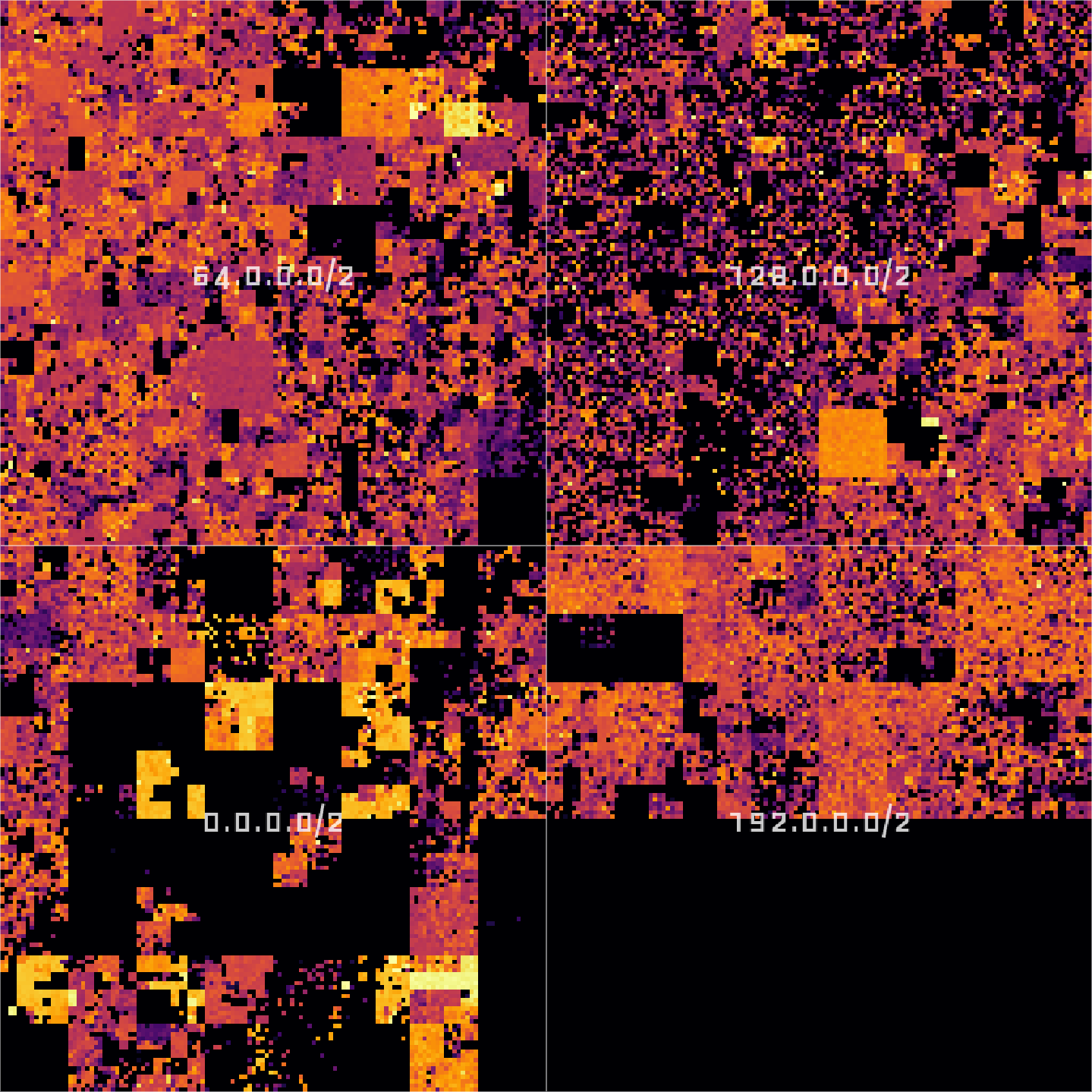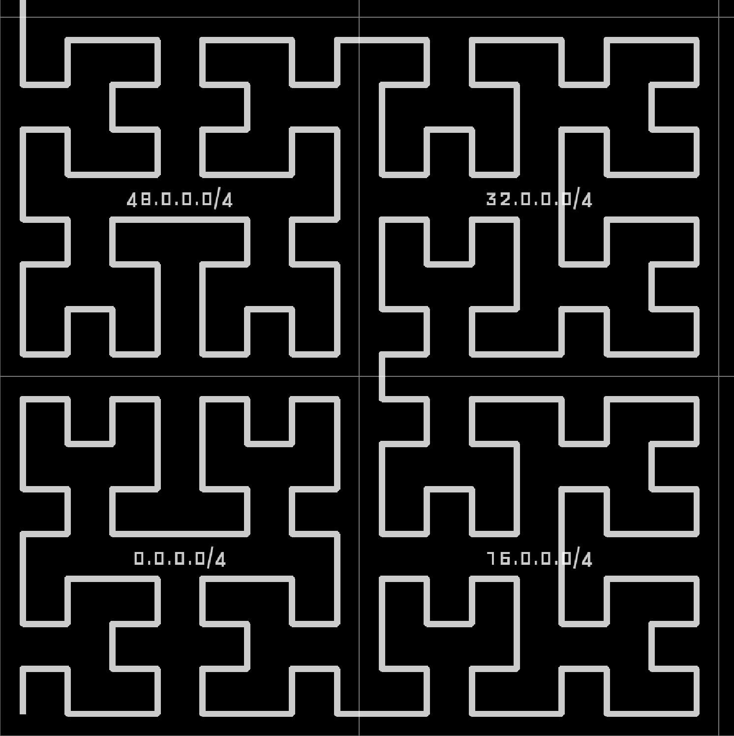 Zooming in further, in the lower right corner, we find that 0.0.0.0/2 actually consists of 0.0.0.0/4, 16.0.0.0/4, 32.0.0.0/4, and 48.0.0.0/4: