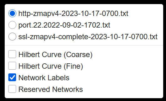 In this blog post I want to showcase a recent project of mine: I took IPv4 port scans gathered by Patrick Sattler et al. (Technische Universität München) and visualized it as a zoomable Hilbert map using Leaflet. Visualization of the Internet using the Hilbert curve is not a new approach, as it has been suggested and implemented by several people in the past. Nevertheless, all existing implementations that I looked at were lacking interactivity, especially the ability to zoom into subnets for closer inspection. That’s why I built https://hilbert.app.jonaslieb.de/!
