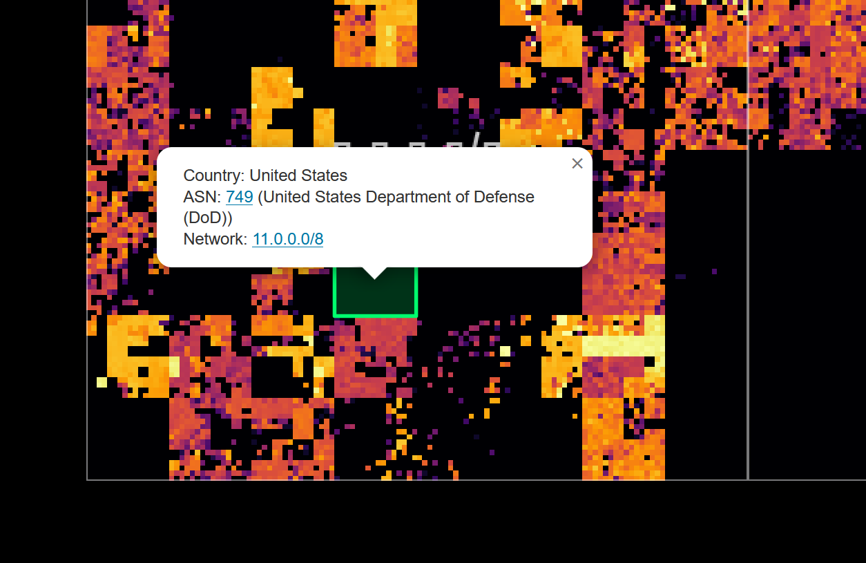 Many of the black patches in the lower left quadrant are networks belonging to the United States Department of Defense: