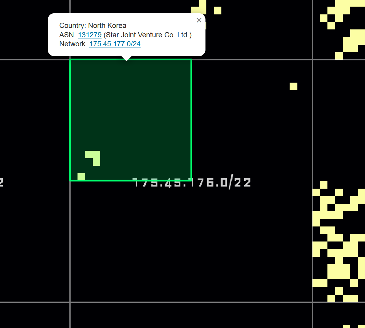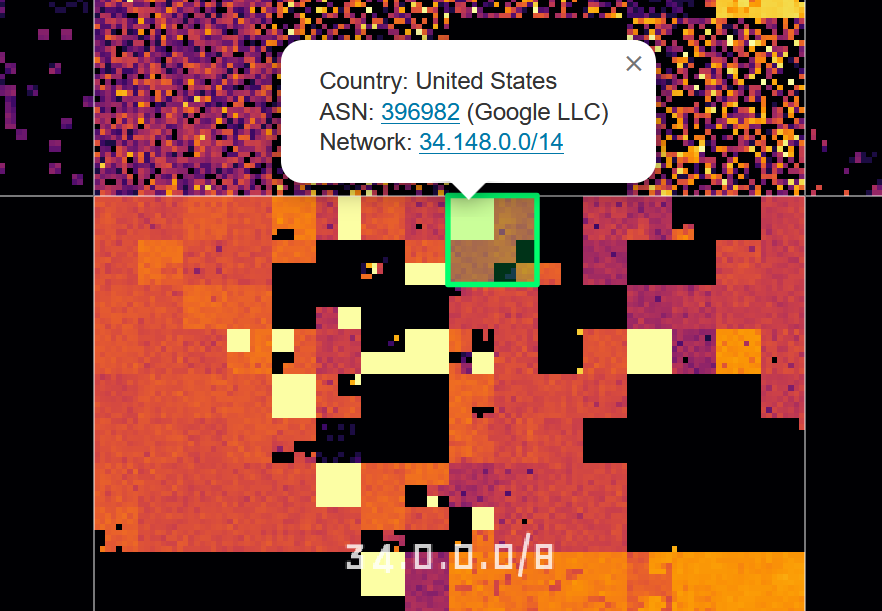 The map is interactive and can be zoomed up to the /24 level. A click on the map brings up a popup containing GeoIP information from a database provided by IPLocate. One can choose between different datasets using a layer selector at the top right: